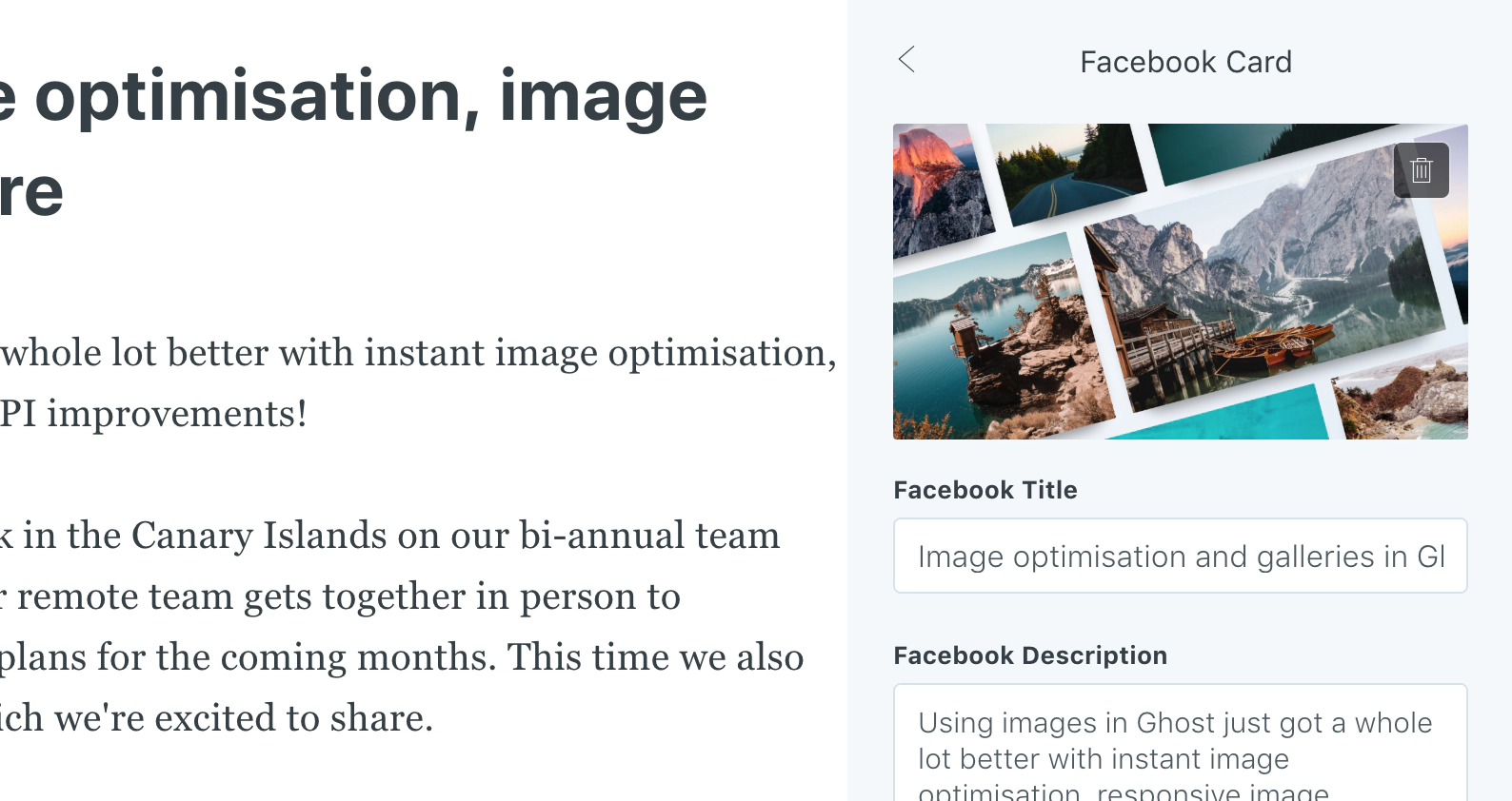 Ghost contains integrated global settings and user settings to associate your site, users, and individual posts with specific Facebook users and pages via automatic Open Graph meta tags. This allows for rich data to appear whenever people share links to your site, as well as association with your official accounts.