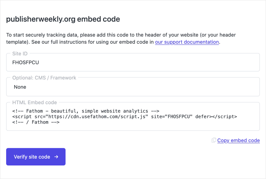 When you create a new site in your Fathom Analytics account, you’ll be given HTML embed code, which you can copy to your clipboard:
